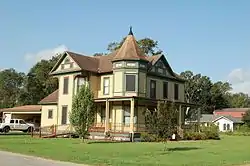 It is a two-story wood-frame house mainly Queen Anne in style, though with aspects of Colonial Revival and Stick/Eastlake. Queen Anne features include its two-story polygonal turret, a band of stained glass windows on the turret just below the roofline, and projecting bays and rooms.[2][3]
