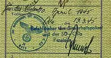 Given the nature of the intelligence operations assigned to the SD, there were clear delineations between what constituted a full member (Mitglied) of the SD and those who were considered "associates" (Mitarbeiter) with a further subset for clerical support personnel (typists, file clerks, etc.) who were connoted as V-persons (Vertrauensleute).[100] All SD personnel, whether simply associates or full members were required to swear an oath of secrecy, had to meet all the requirements for SS membership, were assigned SD code numbers (Chiffre Nummer) and if they were "above the level of V-person" they had to carry "an SD identification card."[101] The vast majority of early SD members were relatively young, but the officers were typically older by comparison; nevertheless, the average age of an SD member was approximately 2 years older than the average Nazi Party member.[102] Much like the Nazi revolution in general, membership in the SS and the SD appealed more to the impressionable youth.[103] Most SD members were Protestant by faith, had served in the military, and generally had a significant amount of education, representing "an educated elite" in the general sense – with about 14 percent of them earning doctorate degrees.[104] Heydrich viewed the SD as spiritual-elite leaders within the SS and the "cream of the cream of the NSDAP."[105]