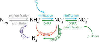 Waste entering this process must first undergo the nitrification of ammonia to nitrite so there is nitrite in high enough concentration for anammox to be fueled. This first step typically needs to convert ~50% of the ammonia in the waste stream before anammox can begin.[3] To obtain this delay a key technique used is to utilize the different growth rates found in ammonia oxidizers and nitrite oxidizers. Ammonia oxidizers have a significantly higher growth rate then Nitrite oxidizers at high temperatures so if utilized properly ammonia oxidizers will reach the log phase and begin the nitrification before the nitrite oxidizers start anammox.[4] Once the Anammox process begins the reactions rates of nitrification vs Anammox must be closely controlled as to completely remove ammonia from the stream. To maintain the balance between these two processes control of the pH is utilized.[3]