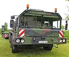 With the deployment of the Leopard 2 MBT a need arose in the German Army for a new tank transporter which would be capable of transporting this new generation of heavier tanks. While the SLT50 Elefant tractor is an off-road vehicle with eight driven wheels, the new transporter, called SLT56, is an 8x6 tractor vehicle by Faun, the FS 42.75/42 (called Sattelzugmaschine, schwer, 8×6 (semi tractor trailer, heavy, 8x6)). The trailer is able to carry 56 tons, made by Kässbohrer, and is called Sattelanhänger 56t, Tieflader, tmil, 12×0 (semi trailer 56t, flat bed, military, 12x0).