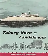 SL ferries (short for Swedish Skandinavisk Linjetrafik or Scandinavian Line Traffic) was a shipping line that operated with car ferries in the central part of Øresund, between Copenhagen, Port of Tuborg, Zealand, Denmark and Landskrona, Scania, Sweden. The shipping line was to sail this route between 1951 and 1980.[1] During the first ten years of operation, the SL ferries was a Danish owned shipping line, but in 1961 SL was bought by Stockholms Rederi AB Svea.[1] The new owners also owned the LB (car ferries) which since 1955 operated at the HH Ferry route between Helsingør (45 km north of Copenhagen) and Helsingborg (25 km north of Landskrona), the first challenger of the de facto monopoly at that route which DSB had enjoyed since 1882.