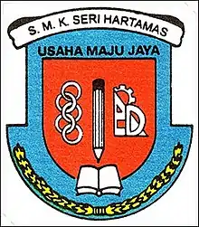 The school badge consists of the words "S.M.K SERI HARTAMAS" on a banner in white against a background shield of Blue. Blue, represents the sense of togetherness. Whereas, Red, represents the message of love that should spread widely between the students and teachers in SMKSH.