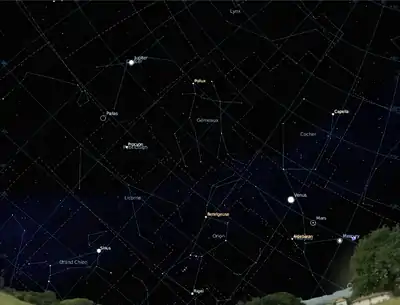 In their controversial article (see European sightings, below) Collins and his colleagues make another suggestion:[13] on the morning of 4 July, the star ζ Tauri was not bright enough and too low on the horizon to be visible. If the guest star, which was located close to it, was visible, it is only because its brightness was comparable to Venus. However, there was another star, brighter and higher on the horizon, which was possibly visible, for reference: Beta Tauri (β Tauri). This star is located at around 8 degrees north-north-west of ζ Tauri. The Crab Nebula is south-south-east of β Tauri. Collins et al. suggest therefore that at the time of its discovery, the star was seen to the south-east of β Tauri, and that as the days passed and visibility improved, astronomers were able to see that it was in fact a lot closer to ζ Tauri, but that the direction "south-east" used for the first star was kept in error.