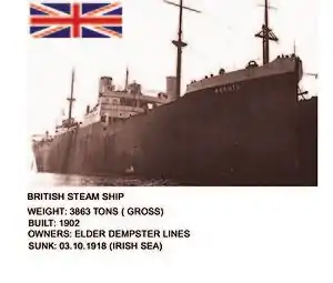 SS Burutu was a British steamship, sunk after a collision with the steamship City of Calcutta off the coast of South Wales about 25 miles south-west of Bardsey Island in the Irish Sea on 3 October 1918.