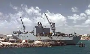 ![]() USNS Capella (T-AKR-293) offloading military vehicles and supplies in the port of Mogadishu in support of Operation Restore Hope. | |