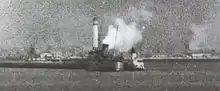 On Tuesday 17 January 1939, whilst lying at anchor in the River Mersey, having taken the sailing from Douglas to Liverpool, Fenella was run into by a cargo ship, the SS Eastleigh, which had arrived from Karachi, and was proceeding to berth at Bromborough Dock.[5] Part of Fenella's belting was carried away, and damage was sustained to one of her lifeboats, along with damage to her plating.[5] Fenella was taken to the Prince's Landing Stage, where she was inspected by representatives of the Board of Trade.[5] Temporary repairs were carried out, and Fenella was able to sail from Liverpool to Douglas the following day.