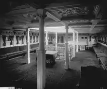 The architect Thomas Colcutt designed Himalaya's public rooms.[14] He designed her music room in neoclassical style, with slim columns with Composite capitals.[15] Her main dining saloon was 60 ft (18 m) long, extended the entire width of the ship, and could seat 206 diners.[16]