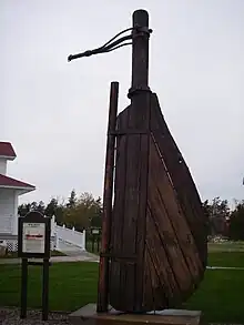 The schooner-barge Michigan was never seen again after the night of 2 October 1901.[1] The wreck of Drake was first discovered by Captain Campbell of Liberty just four days after she sank on 6 October 1901, when he was downbound for the Soo Locks. Captain Campbell reported that Drake was located between Vermilion Point and Whitefish Point lying on her side in 40 feet (12 m) of water with about 5 feet (1.5 m) feet of water over her with a floating spar still strung to the hull.[1] The wreck of Drake lay forgotten on the bottom of Lake Superior for 77 years until she was rediscovered at 46°46.588′N 85°05.933′W / 46.776467°N 85.098883°W in 1978, by the Great Lakes Shipwreck Historical Society (GLSHS)[6] who subsequently illegally removed her rudder, windlass, anchor, and a sign board in the 1980s. Michigan’s Antiquities Act of 1980 prohibited the removal of artifacts from shipwrecks on the Great Lakes bottomlands. The Evening News reported a Michigan Department of Natural Resources and Environment 1992 raid on the Great Lakes Shipwreck Museum and its offices that found evidence of 150 artifacts illegally removed from the state-claimed bottomlands, including artifacts from Drake.[7][8][9] Following a settlement agreement with the GLSHS, Drake's rudder, anchor, and windlass are now the property of the State of Michigan.[8][9] The rudder is on loan to the GLSHS for display nearby the Great Lakes Shipwreck Museum and the anchor and windlass is on loan to Whitefish Township for display next to its community building.