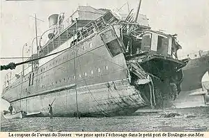 On 24 March 1916, Sussex was on a voyage from Folkestone to Dieppe when she was torpedoed by SM UB-29.[8] The ship was severely damaged, with the entire bow forward of the bridge blown off.[6] Some of the lifeboats were launched, but at least two of them capsized and many passengers were drowned.[9][10] Of the 53 crew and 325 passengers,[11] at least 50 were killed,[4] although a figure of between 80 and 100 is also suggested. Sussex remained afloat and was eventually towed stern-first into Boulogne harbour.[11]
