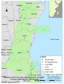 In the late 1990s, Mr. Domician Njao, from Tanzania National Parks Authority (TANAPA) came in to "upgrade" the reserve to a National Park, and create the first and only coastal national park of Tanzania. In doing so, park authorities redrew the boundaries of the reserve to include Uvinje’s and Porokanya’s prime coastal lands as if they have always been a part of the reserve in so doing changing the agreement with those villagers. Compelling research shows how after this TANAPA proceeded to gazette most of Saadani’s coastal lands as part of the Saadani National Park in 2005, arguing that they have always being a part of the former reserve and belonged to the Park.[3] Spatial analysis on the area of the former Saadani Game reserve, illustrates TANAPA's strategy to gazette Saadani's prime coastal lands as if they have always been a part of the SGR. The total extent of SGR is said to have been approximately 209 km2 (81 sq mi), however, the SGR official gazette document states that it comprised approximately 300 km2 (120 sq mi),[4]