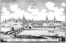 In 1389 the town finally was acquired by Landgrave Balthasar of Thuringia, a member of the House of Wettin.[3] Saalfeld's economy prospered from surrounding mines, transport on the Saale River as well as from fishing (expressed by the barbels in the town's coat of arms). The Wettin rulers had the Gothic Saint John hall church erected at the site of a Romanesque predecessor building until 1514. The Gothic town hall was completed in 1537. The ruling dynasty reached its height of importance, when in 1423 all Wettin lands including the Thuringian estates were incorporated into the Electorate of Saxony (Upper Saxony).