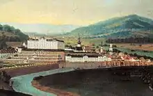 The castle was destroyed by imperial troops on 16 May 1677.[9] It was restored around 1696 by architect Josef C. Motte, nicknamed la Bonté, on the orders of Countess Eleonore Clara of Hohenlohe-Gleichen, the widow of Count Gustav Adolph and her son Louis Crato. The wing adjacent to the road to St. Arnual Rauschen Thal (today's Talstraße) was, according to reconstruction plans that have been preserved, carried out à la mode.[10] The courtyard was opened to the garden on the south side and bordered by a single-storey arcade hallway. The garden was extended beyond the castle wall and far into the valley as a terraced French formal garden. A sepia drawing, made after 1710, probably by Anton Kohl, shows the castle and the market square.[11] It shows the ground plan of the restored castle. A low arcade tract replaces the earlier east wing. The west wing was a Bergfried, which had been built during the reign of the Hohenstaufens.