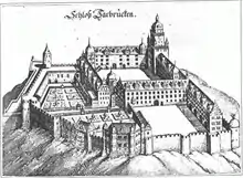 Johann Andreae, the chronicler of the Counts of Nassau-Saarbrücken, reports that Count Philip IV built a summer residence in Saarbrücken and provides a sketch of appearance of the medieval castle. It had a trapezoid-shaped inner court, surrounded by buildings of different widths. There was a tower on the western side. The bailey on the Saar side was enclosed on the northwest and southeast by buildings.[4] The summer house had been designed by architect Christmann Stromeyer from the Electorate of the Palatinate and stood on the southeastern edge of the cliff .[5] The castle was surrounded in the north-east by the Saar Rocks and the river Saar, on the east by a ditch and on the south and southwest by the bulwark and a moat. The entrance was the drawbridge opposite the large tower. At the southern end of the garden was a red tower[6] and at the northern corner a small round tower.[4]