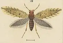 ♀. 6-5 mm. Head ochreous, with a dense spreading frontal tuft of long coarse hair. Antennae ochreous, with broad blackish bands at base, at 1⁄2, and before apex. Thorax ochreous. Abdomen fuscous-grey. Legs ochreous, tarsi annulated with blackish. Forewings rather broad, apex broadly pointed ; ochreous irrorated with dark fuscous; three or four incomplete black strigae on apical 1⁄4: cilia ochreous, with a black bar marking apex of the wing. Hindwings and cilia grey-fuscous.[3]