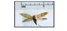 The larvae are small in size with a mature larva being only 2.5 mm in length.[2] It is coloured pale green and has darker green to black patches on the posterior portion of its body.[2]