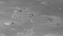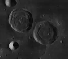 The outer rim of this crater is roughly circular and relatively featureless. The interior floor has a pair of small craterlets and a central rise. There is a ridge at the western edge of the floor that is concentric with the inner wall.