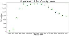 Sac County is a county located in the U.S. state of Iowa. As of the 2020 census, the population was 9,814.[1] The county seat is Sac City.[2] Both were named for the Sauk people, a local American Indian tribe.