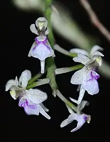 Saccolabiopsis, commonly known as pitcher orchids,[2] is a genus of flowering plants from the orchid family, Orchidaceae. Plants in this genus are small epiphytes with short, fibrous stems, smooth, thin roots, a few thin, oblong to lance-shaped leaves in two ranks and large numbers of small green flowers on an unbranched flowering stem. There are about fifteen species found from the eastern Himalayas to the south-west Pacific.