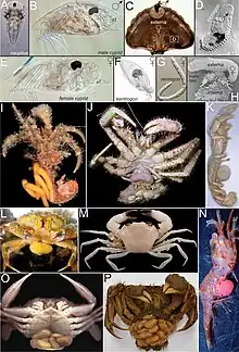 Rhizocephala. A–H, life cycle stages and larval morphology of selected Rhizocephala. A, Nauplius larva of Sacculina carcini. B, Male cyprid of S. carcini. C, Settled male cyprid of Lernaeodiscus porcellanae in the mantle aperture of a virginal female reproductive body (externa). D, Male trichogon of S. carcini dissected from the mantle cavity of a virginal female externa. E, Female cypris of S. carcini. F, Kentrogon of S. carcini, inside the empty cuticle of the spent female cyprid, in the process of injecting the primordial parasite. G, Vermigon of Loxothylacus panopaei. H, Scanning electron micrograph of Peltogaster curvata, showing the reproductive sac (externa) connected to the ramified internal root system. I-P, Diversity of Rhizocephala externae on various hosts.