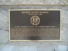 In 2005, after the 100th anniversary of Sacred Heart Church, the Jesuit community which had long served the parish withdrew in order to concentrate on their academic institutions throughout the South. The fourth bishop of the Diocese of St. Petersburg, Most Rev. Robert Lynch, invited the Franciscan Friars of the Most Holy Name of Jesus Province to assume the pastoral responsibilities for the parish. The current pastor is Father Stephen Mimnaugh,[8] OFM. In 2010 the Diocese of St. Petersburg added a Catholic Heritage Marker to the church exterior, recognizing its historic significance.[9]
