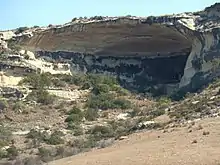 The Motouleng caves, meaning 'place of beating drums', are located in the mountains of the eastern Free State and Lesotho, between Clarens and Fouriesberg. The large cave was created in a limestone mountain by a rock fall. A small river and pools lie below the cave.[3] There is a fountain at the entrance of Motouleng called 'Sediba sa Bophelo', meaning 'The Fountain of Life' where people drop coins for good fortune. The cave is a 2 km hike from the nearest farm, which is located 15 km out of Clarens. Locals go as they please while visitors are required to attend guided tours to ensure respect for the ancestors. Women are required to wear long skirts and cover themselves up out of respect.[2]