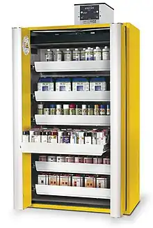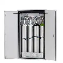 A safety cabinet is used for the safe storage of flammable chemical substance or compressed gas cylinders.[1]