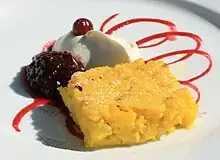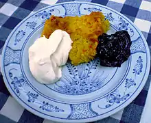 Saffranspannkaka or Gotlandspannkaka (English: saffron pancake or Gotland pancake, Gutnish: saffranspannkake or saffranspannkakå) is a dessert from the island of Gotland, Sweden, and is considered as one of their provincial dishes.[1] It is made of pudding rice, cream, milk, sugar, egg, chopped almonds, and saffron. The cake can be eaten lukewarm or cold and is served according to tradition with dewberry jam and whipped cream.[2][3] If necessary, with regard to allergies, the almonds can be excluded.