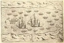 The ongoing war between the Spanish Empire and the Dutch Republic was matched by hostilities in Maluku where Spain and Tidore stood against the VOC and Ternate.[5] The Dutch actively tried to prevent any attempts to make a separate peace between Ternate and Tidore. The VOC noted that Saidi was a political man who was no great friend of Spain but who strove to secure Tidore's position within the power balance between the Europeans.[6] Several clashed nevertheless took place during the 1640s. Tidore turned out to be the more successful "due to its greater carefulness and bravery"[7] Foodstuff was brought to Tidore from its vassals in Halmahera and even from the Papuan Islands, where Tidorese influence had been established by this time. One of Saidi's helpers was the chief Gurabesi whom later traditions associate with the origins of Tidore rule in the Papuan lands.[8] In 1649 a number of battles and mutual raids took place, culminating in a Tidore-Spanish invasion in Ternate where the Dutch were defeated with considerable losses. Before the VOC were able to stage a counter-attack, news of the Peace of Westphalia reached the East Indies, and hostilities were cancelled.[9]