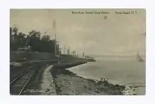 The station opened on February 23, 1886.[4][5] The station was located on a wooden trestle on the shore of the Kill Van Kull on the edge of the island below street level. It was built with two slightly-staggered wooden high-level side platforms which could only fit one train car; the north Arlington-bound platform had direct access to the docks of the harbor. Exit stairs and the overpass to Richmond Terrace were located at the east end of the station.[6][5][7][8] The station was closed on March 31, 1953 along with all other stations on the North Shore Branch.[4][5]