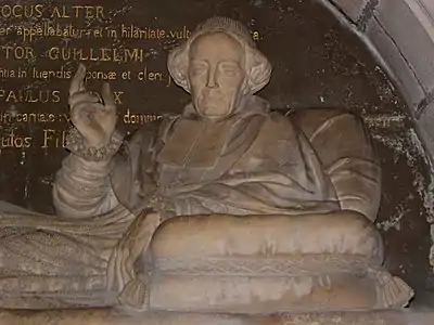 The cathedral contains the tomb of Monseigneur Jacques Jean-Pierre Le Mée who was bishop of Saint-Brieuc and Tréguier from 1841 to 1858 succeeding Monseigneur Le Groing de la Romagère. He was the superior of the "Filles du Saint-Esprit", held a synod for them in 1851, and built a new seminary. He founded Saint-Brieuc's école Saint-Charles, Guingamp's Notre-Dame institute and the Saint-Joseph college at Quintin. He died on the 31 July 1858 at the age of 64.[7] The effigy of Le Mée, kneeling at a prie-dieu was the work of Pierre-Marie-François Ogé and dates to 1859. The tomb stands in an enfeu originally holding the tomb of Jean Prigent who had built the chapel in 1472. This had been destroyed during the French Revolution.[5]