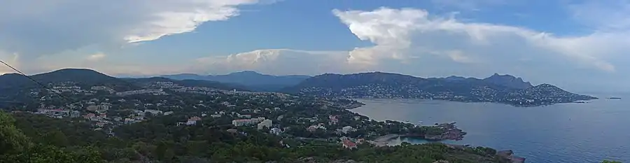 Situated almost entirely on the Esterel Massif, the commune sits on soil of red porphyr, which makes for very picturesque scenes along the coast where the soil and rocks are exposed on cliff faces and rocky shores. Three important and spectacular rocks dominate the seascape: Cap Roux at 360 m (1,180 ft), Saint-Pilon at 295 m (968 ft), and the Rock of Saint-Barthélemy.