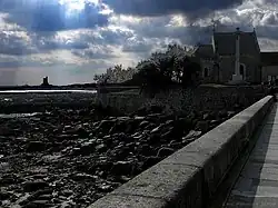 The medieval parish, fiefdom of Fécamp Abbey, is under the patronage of Saint Vaast, who never came to Normandy; it was in French Flanders that he exercised his priesthood, as bishop of Arras.[13] It was probably during the construction in the 11th century of the first church, the current Sailors' Chapel, that the monks of Fécamp Abbey chose Saint Vaast as their patron.[13] For Éric Barré, the dedication of the church of La Hougue to Saint Vaast, and by extension the name of the parish, would be the result of the meeting of the fishermen of the place with the fishermen of Artois and Picardy in the Baie de Seine.[18] According to local tradition, the region was evangelized by Vaast d'Arras, bishop of Arras and Saint Vigor, bishop of Bayeux in the 6th century. While they were going towards what would become Quettehou, the bishops had to cross La Bonde on a wooden plank which gave way to the passage of Saint Vaast. La Bonde still serves as a boundary between the two parishes.[18][13]