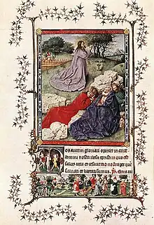Noting the similarity of Francis's pose to the kneeling figure in the "Turin-Milan Hours" miniature of The Agony in the Garden, Borchert, who believes van Eyck's work as a manuscript illuminator came late in his career, concludes that both were completed after the master had died, perhaps completed by members of the workshop.[59] Unlike Borchert, Luber thinks that The Agony evidences his early experiments with perspective, as he began to resolve the transition between foreground and background, by placing the fence in the mid-ground, a device found in the St Francis through the positioning of the rocks.[60] Luber says the underdrawings in the miniature are similar to those in the St Francis paintings, and stylistically typical of those in van Eyck's later work, an important factor when considering attribution.[61]