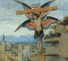 St Francis lived austerely, in imitation of Christ. He embraced the natural world, and took vows of poverty, charity and chastity. In 1224 at La Verna, he experienced the mystical vision which van Eyck portrays.[36] Thomas of Celano, author of Francis's hagiography, describes the vision and stigmatization: "Francis had a vision in which he saw a man like a seraph: he had six wings and was standing above him with his hands outstretched and his feet bound together, and was fixed to a cross. Two wings were lifted above his head, and two were spread ready for flight, and two covered his whole body. When Francis saw this he was utterly amazed. He could not fathom what this vision might mean."[38] As he meditated, "marks of nails began to appear on his hands and feet ... His hands and feet seemed to be pierced by nails appearing on the inside of his hands and the upper side of his feet ... His right side was scarred as if it had been pierced by a spear, and it often seeped blood."[39] To the medieval observer, the appearance of the stigmata signifies Francis's complete absorption in the vision of the seraph.[40]