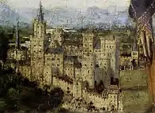 The landscape shows a fictive Flemish city. As in the diptych in New York, some buildings and landmarks can be identified with Jerusalem.[27] It closely resembles the background of the Rolin panel, which has undergone much deeper attention from scholars, with several identifications made with structures in Jerusalem, including the Mosque of Omar, known to van Eyck through second-hand textual and visual descriptions.[27] People and animals populate the city walls, but some are only visible under magnification in the Philadelphia painting.[30] The lake by the city shows a boat whose shadow is reflected in the water.[27] Reflective water surfaces were another typical Eyckian innovation, one he seems to have mastered early, evidenced by the water scenes in the "Turin-Milan Hours",[31] and which requires a considerable degree of artistry.[32] Plants consist of tiny foreground flowers, larger mid-ground grasses and background bushes and trees.[33] The small carpet of white flowers in the foreground is reminiscent of those in the Ghent Altarpiece's central panel;[34] behind Francis are dwarf palms.[35]