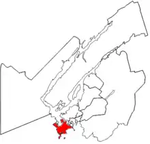The riding of Saint John Lancaster (as it exists from 2014) in relation to other electoral districts in Greater Saint John.