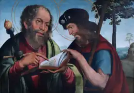 The painting, as an altarpiece, also features a predella underneath it; it has three smaller paintings depicting Saint John the Evangelist and Saint Andrew, Saint Bartholomew and Saint Jude, and Saint Paul and Saint James.[2]