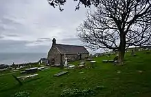 Seeking a place to live out the religious life, Tudno went to the great ancient limestone outcrop of the Great Orme (Cyngreawdr), jutting from the Creuddyn Peninsula, to bring the message of Christianity to its people. He lived initially as a hermit in a small coastal cave with difficult access known as Ogof Llech, which provided protection from the elements, and a source of fresh water from a spring well Ffynnon Llech.[2] From this base he constructed a church. Nothing remains of this 6th century church building, although the present 12th century church, dedicated to St Tudno, stands on the same site, and has a continuous history.[3]