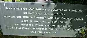 On 9 June 1798, a British force was ambushed in a wood near Saintfield. About 100 men were killed altogether, and the United Irishmen emerged victorious. The headstones of men who were killed in this battle can be seen near the river at the bottom of the First Presbyterian Church graveyard. Following a patriotic sermon delivered by Birch, the insurgents marched south to the main rebel encampment at Ballynahinch, where on 13 June they were routed by government forces. In the aftermath of the battle, Saintfield was sacked and only a few pre-1798 buildings remain.[6]