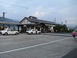 The station has one ground-level side platform and one ground-level island platform connected by a footbridge. The station is attended.