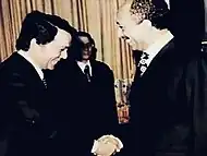 Zulfikar shaking hands with the Egyptian President Anwar Sadat in Cairo, 1976