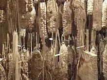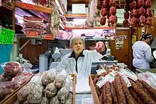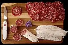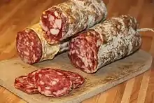 The word originates from the word sale ("salt") with a termination (-ame) that in Italian indicates a collective noun.[4] Thus, it originally referred to all kinds of salted meats. The Italian tradition of cured meats includes several styles, and the word salame soon specifically meant only the most popular kind—a salted and spiced meat, ground and extruded into an elongated, thin casing (usually cleaned animal intestine), then left to undergo natural fermentation and drying for days, months, or even years.