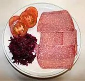 Fermented pork back fat that is used to make salami has very high saturated fatty acid and cholesterol content, which are believed to be risk factors for cardiovascular disease.[34][35] However, it has been shown that it is possible to replace the pork back fat in salami with extra virgin olive oil, thereby changing the fatty acid profile of the salami. Olive oil contains far more monounsaturated and polyunsaturated fatty acids, so this substitution purportedly creates a healthier product.[36] Salami is considered slightly acidic due to lactic acid that is present. Salami where extra virgin olive oil was substituted for the pork back fat has been shown to have a lower pH of around 5.00 compared to its original levels of around 6.35 to 6.55, making the salami more acidic.[36] These lower pH levels are healthier for humans as higher populations of lactic acid bacteria inhibit the spread of spoilage microorganisms.[36]