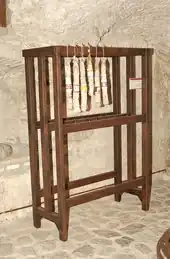 Hungarian-type salami is a specialty in salami production, because it is first slightly smoked and mold-ripened afterward.[25] Szegedi téliszalámi, a Hungarian winter salami, is made of raw pork, bacon, salt, spices, sugars, and sodium nitrite.[25] The Mangalitsa pork breed, with equine large intestine used as its casing to preserve and serve it.[31] This type acquires a grey mold cover on it and has a firm texture and excellent keeping quality after a 30% weight loss reached in 3 to 4 months.[31]