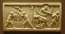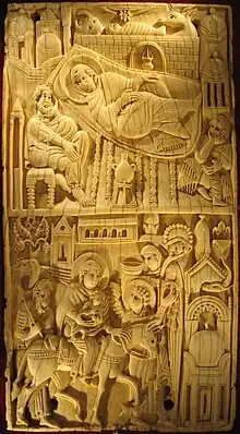 The Salerno Ivories are a collection of Biblical ivory plaques from around the 11th or 12th century that contain elements of Early Christian, Byzantine, and Islamic art as well as influences from Western Romanesque and Anglo-Saxon art.[1] Disputed in number, it is said there are between 38 and 70 plaques that comprise the collection.[2] It is the largest unified set of ivory carvings preserved from the pre-Gothic Middle Ages, and depicts narrative scenes from both the Old and New Testaments.[3] Some researchers believe the Ivories hold political significance and serve as commentary on the Investiture Controversy through their iconographies. The majority of the plaques are housed in the Diocesan Museum of the Cathedral of Salerno, which is where the group's main namesake comes from. It is supposed the ivories originated in either Salerno and Amalfi, which both contain identified ivory workshops, however neither has been definitively linked to the plaques so the city of origin remains unknown. Smaller groups of the plaques and fragments of panels are currently housed in different museum collections in Europe and America, including the Metropolitan Museum of Art in New York, the Louvre in Paris, the Museum of Fine Arts in Budapest, the Hamburg Museum of Art and Trade, and the Sculpture Collection in the Berlin State Museums.[4][5]