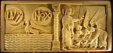 It is disputed that there are between 38 and 70 figurative plaques, thirteen medallions, and seventeen border carving fragments.[2][8] The majority of the Salerno Ivory panels are well-preserved and in excellent condition.[3] They are carved in relief into flat segments of ivory. There are eighteen plaques that depict scenes from the Old Testament.[9][10] These plaques are on average 12 cm to 24 cm wide and about 9 cm tall, while many of the New Testament plaques average 24 cm tall and 12 cm wide.[3] Cornices and borders average from 21 to 25 cm long by about 7 cm wide.[11] The supporting columns are about 23 cm by 2 cm and the busts are 6 cm squared.[11] Most of the plaques are divided into an upper half and lower half and contain two separate scenes, with a few exceptions.[3][2] The plaques that depict the Old Testament are oriented horizontally, whereas the plaques that depict the New Testament are oriented vertically.[3]