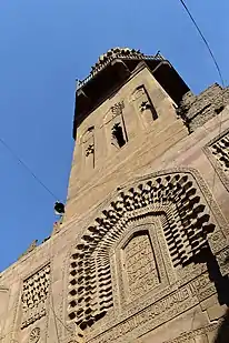 The Salihiyya Madrasa broke the Ayyubid tradition of only adding minarets to Friday mosques to call Muslims to prayer in that mosque.[7] The madrasa's minaret is positioned directly over the entrance of the madrasa. The structure has two shafts topped by ribbed helmet domes divided by a balcony and is known as a mabkhara ("incense burner.")[1] The lower shaft is rectangular and on each of its sides are three tall, recessed, keel-arched panels with ribbed hoods. Its upper shaft is octagonal in shape and also with keel-arched panels. Unlike its lower counterpart, however, it is a more open structure filled with lobe-arched windows. The bases of the minaret's domes are decorated by two bands of muqarnas.[1]