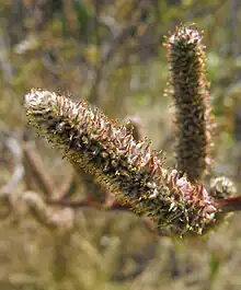 Salix breweri is a species of willow known by the common name Brewer's willow. It is endemic to California, where it can be found in the serpentine soils of the Coast Ranges in and around the San Francisco Bay Area. It is a riparian shrub growing one to four meters in height. The yellowish or reddish brown stems are lightly hairy in texture, the small twigs coated in velvety fibers. The leaves are generally lance-shaped, smooth-edged or gently toothed, and partially rolled under along the edges. The leaves are hairy, with the lower surfaces often quite woolly. Mature leaves may be 14 centimeters long or more. The inflorescence is a catkin which develops before the plant produces leaves. The catkins are up to 5 or 6 centimeters long, the female ones lengthening further as the fruits develop.
