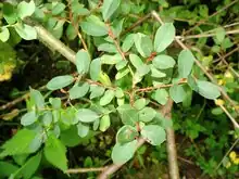 The leaves are simple, alternate, and glabrous, with a petiole 1 to 3 mm (0.039 to 0.12 in) long. The blade is 0.5 to 3 cm (0.20 to 1.18 in) long and 0.3 to 1 cm (0.12 to 0.39 in) wide, elliptical to obovate, with a pointed (rarely blunt) tip and a wedge-shaped base. They are dark green on the upper surfaces and blueish green on the undersides. The leaf margin is nearly smooth. The stipules are usually small.