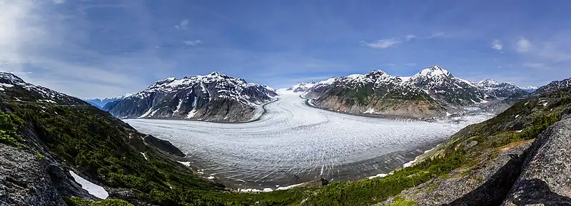 ![]() View of the Salmon Glacier from the viewpoint. Mount Bayard to left, Mount White-Fraser partially visible to right. | |